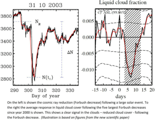 A new study just published in the Aug. 19th issue of Journal of Geophysical Research: Space Physics comes down in favor of cosmic rays. According to spaceweather.com, a team of scientists from the Technical University of Denmark (DTU) and the Hebrew University of Jerusalem has linked sudden decreases in cosmic rays to changes in Earth’s cloud cover. These rapid decreases in the observed galactic cosmic ray intensity are known as “Forbush Decreases” and tend to take place following coronal mass ejections (CMEs) in periods of high solar activity. When the sun is active (i.e., solar storms, CMEs), the magnetic field of the plasma solar wind sweeps some of the galactic cosmic rays away from Earth. In periods of low solar activity, more cosmic rays bombard the earth. The term “Forbush Decrease” was named after the American physicist Scott E. Forbush, who studied cosmic rays in the 1930s and 1940s.The research team led by Jacob Svensmark of DTU identified the strongest 26 “Forbush Decreases” between 1987 and 2007, and looked at ground-based and satellite records of cloud cover to see what happened. In a recent press release, their conclusions were summarized as follows: “[Strong “Forbush Decreases”] cause a reduction in cloud fraction of about 2 percent corresponding to roughly a billion tonnes of liquid water disappearing from the atmosphere.”